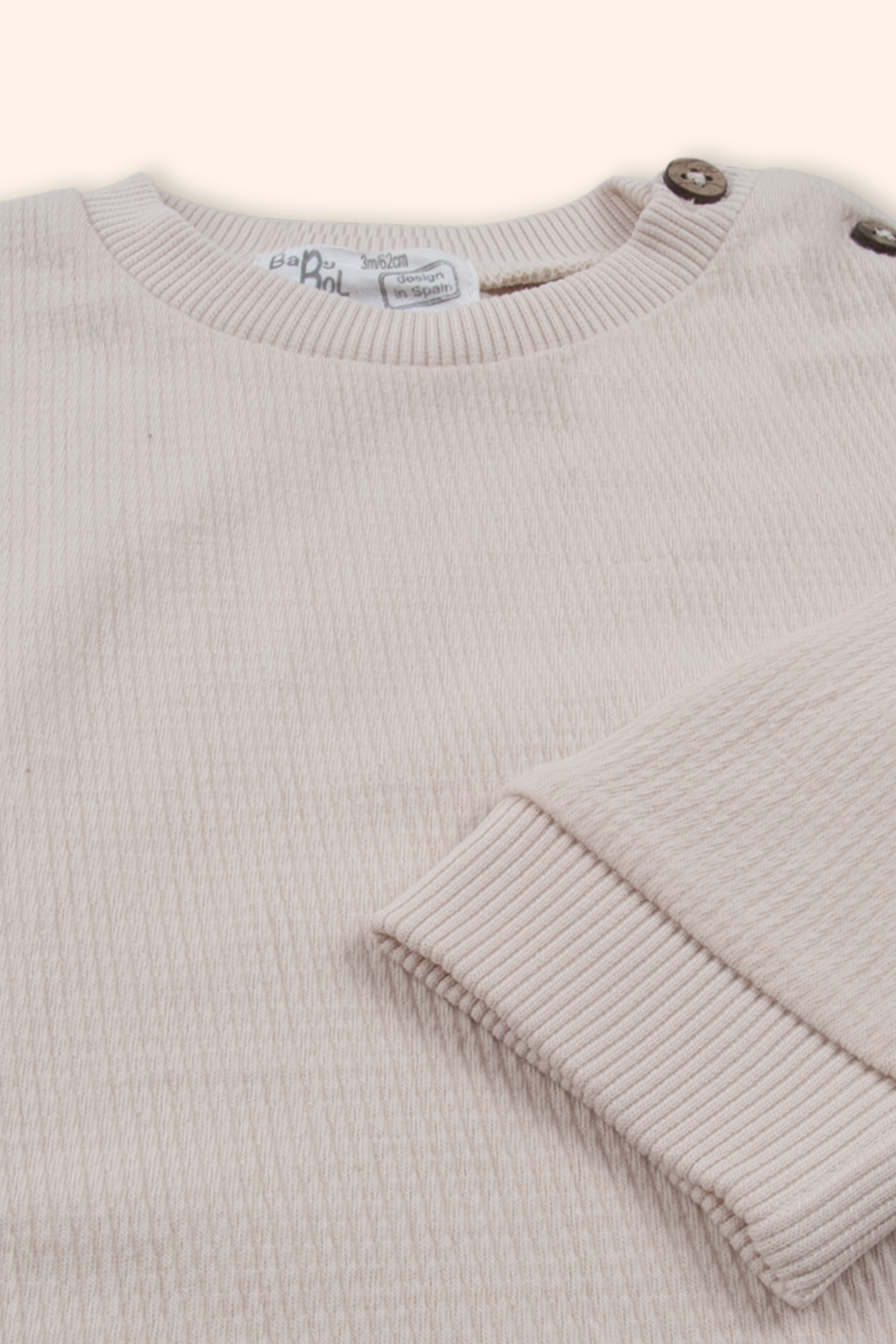 Camisola de malha canelada em tom bege suave, perfeita para um look elegante e confortável.