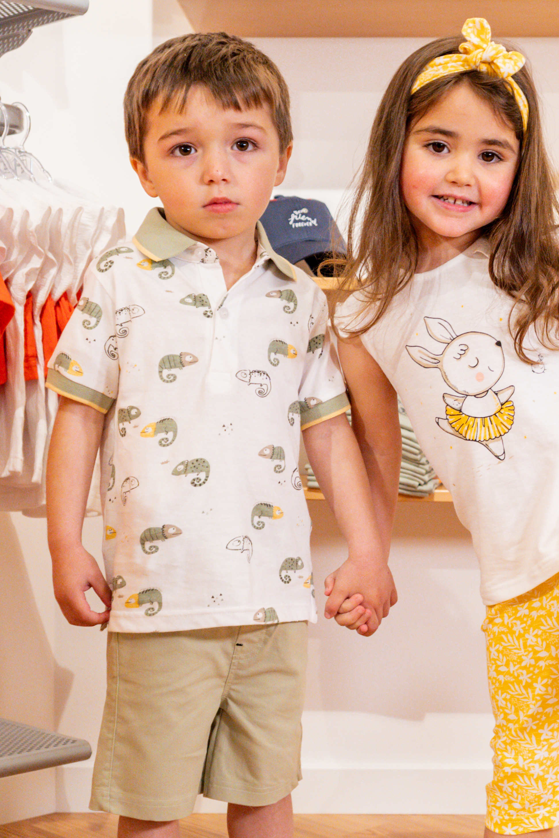 Este conjunto é composto por um pólo branco estampado com camaleões e detalhes contrastantes na gola e mangas, combinado com calções verde suave, garantindo um look confortável e cheio de estilo para os dias quentes.