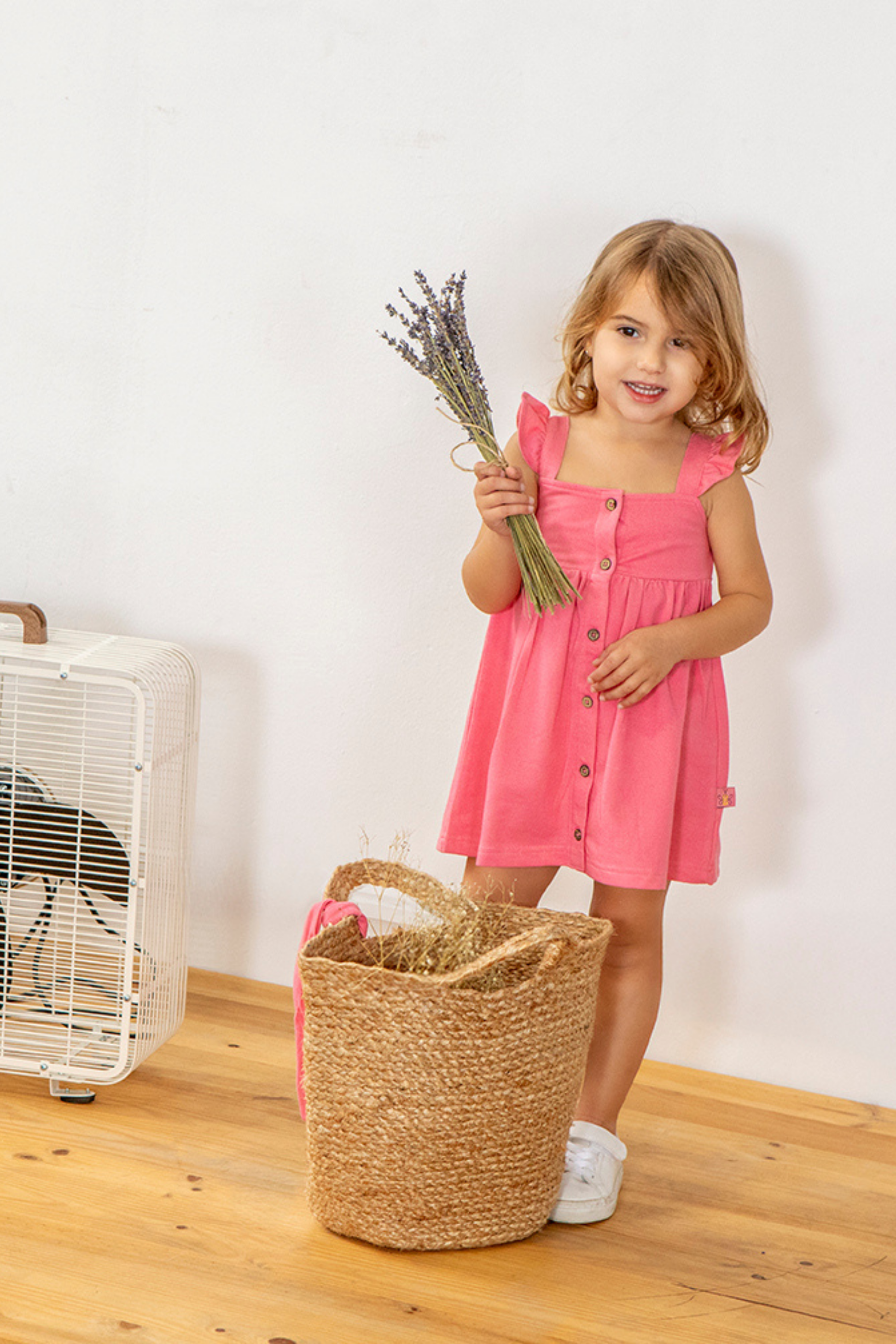 Este vestido rosa com alças e folhos nos ombros traz um toque romântico e descontraído, perfeito para dias ensolarados.